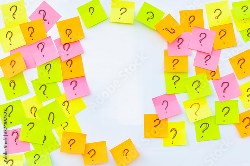Daylight. natural wood is neatly glued together and paper of different colors is tilted to the top painted in white. There are several of them. Texture. a question mark is drawn on the stickers.