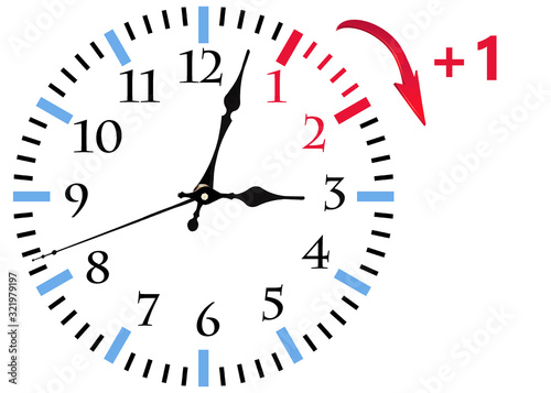 Daylight Saving Time (DST). Blue sky with white clouds and clock. Turn time forward (+1h).