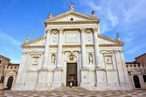 Daylight view from bottom to front facade of San Giorgio Maggiore entrance