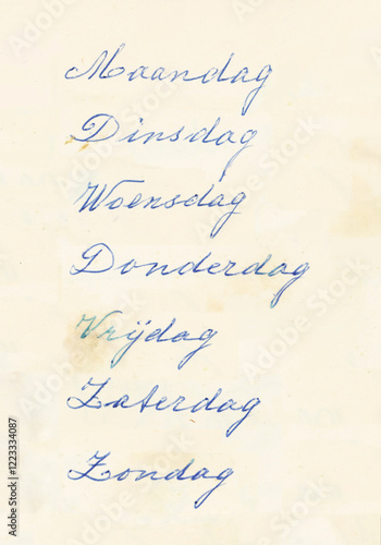 Days of the week written in 1966 by a seventy year old lady in Dutch. Maandag Monday, Dinsdag Tuesday, Woensdag Wednesday, Donderdag Thursday, Vrijdag Friday, Zaterdag Saturday, Zondag Sunday