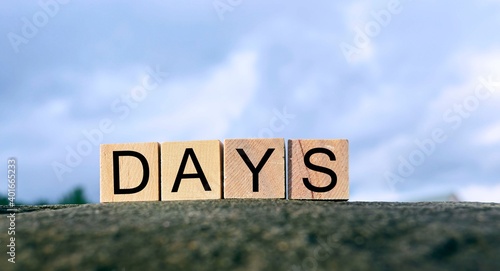 Days text on wooden block on top of big stone with blurred sky background