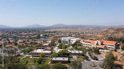 Daytime aerial view of a suburban neighborhood in Moreno Valley, California, USA.
