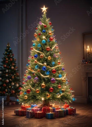 Dazzling Christmas tree, colorful ornaments, twinkling lights, glowing scene , bokeh, yellow