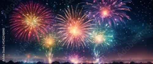 Dazzling display of fireworks bursting in a variety of colors against the night sky, symbolizing celebration festivity