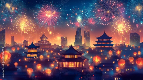Dazzling Fireworks Display Over Illuminated Asian Cityscape - Vibrant Celebration, Festive Skyline, Nighttime Spectacle