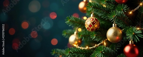 Dazzling gold baubles adorn a majestic evergreen tree as colorful lights dance around it, Evergreen Tree, Festive Decor, Twinkling Lights