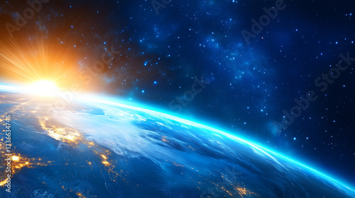 Dazzling sunrise occurs above the horizon of Earth, illuminating the planet with brilliant orange and gold hues against a deep blue and black cosmos. Stars twinkle in the backdrop
