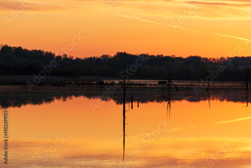 Deadwood in silhouette in the Léon-Provancher marsh during a colourful sunrise, Neuville, Quebec, Canada