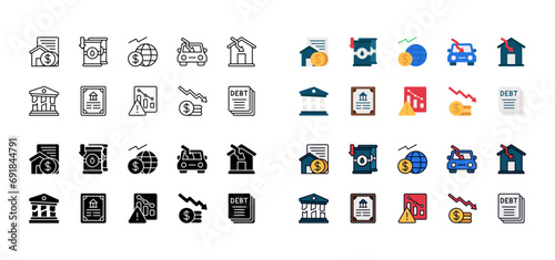 Debt Crisis Icon Set, set of bankruptcy, Monetary Crisis, Fiscal, Public Debt and more. Outline, flat, filled line, glyph solid