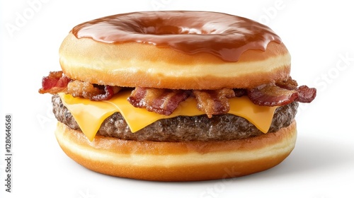 Decadent burger featuring a juicy beef patty, melted cheese, crispy bacon, and sweet glazed donut bun.