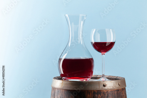 Decanter with red wine on old wooden barrel