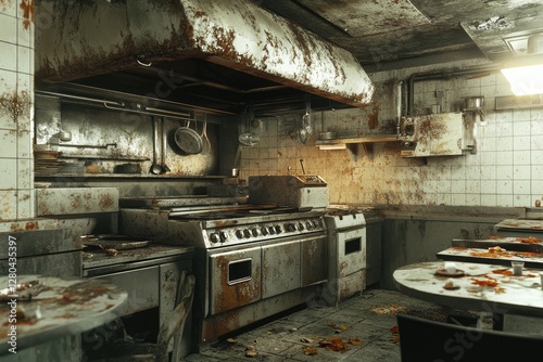Decayed kitchen, abandoned restaurant, rust, autumn leaves. Use Stock photo