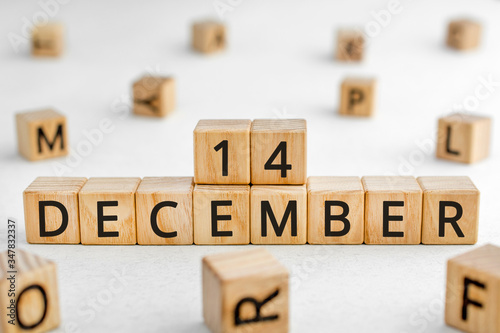 December 14 - from wooden blocks with letters, important date concept, white background random letters around