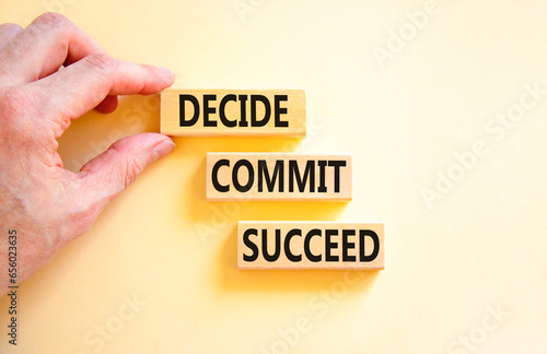 Decide commit succeed symbol. Concept word Decide Commit Succeed on beautiful wooden block. Businessman hand. Beautiful white table background. Business decide commit succeed concept. Copy space.
