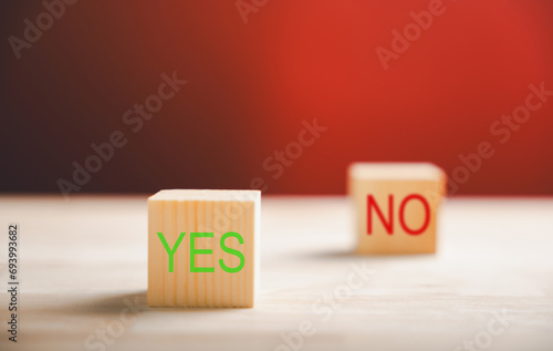 Decision-making concept portrayed by wooden block's green check mark and red x. Choice symbolism shown. Think With Yes Or No Choice.