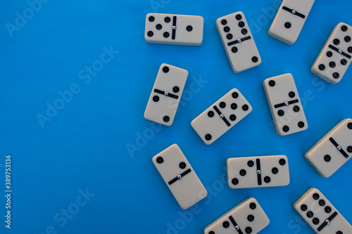 Deck of scattered dominoes on vibrant blue background. Top down view flat lay with empty space for text