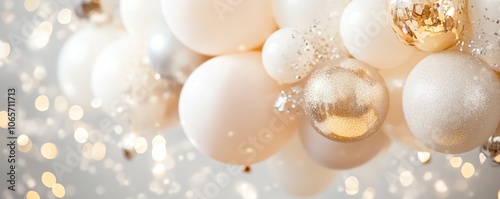 Décor festif de ballons blancs et champagne avec paillettes dorées.