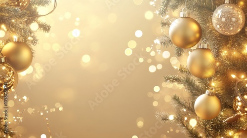 decorated Christmas tree adorned with shimmering gold ornaments and a warm, glowing background of bokeh lights.