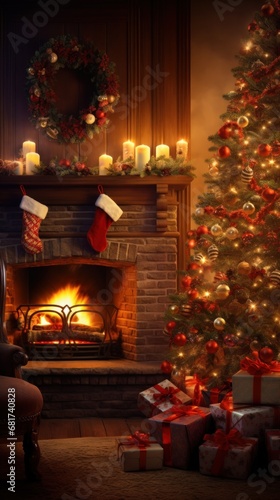 decorated Christmas tree, presents, and a roaring fire in the fireplace