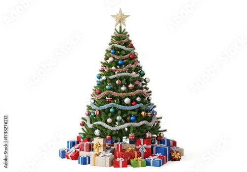 Decorated Christmas Tree with Colorful Baubles and Gift Boxes