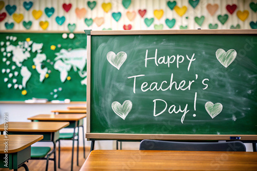 Decorated Classroom Celebrating Teacher's Day with Blackboard Chalk Message. Colorful Hearts Hang Above as Chalkboard Reads 'Happy Teacher's Day!' in a Bright, Cheerful, and Festive Classroom Setting.