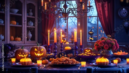 Decorated dining room with a table full of spooky treats and eerie candlelight