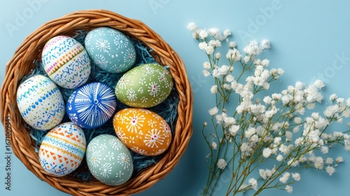 Decorated Easter eggs in wicker basket, spring flowers, blue background