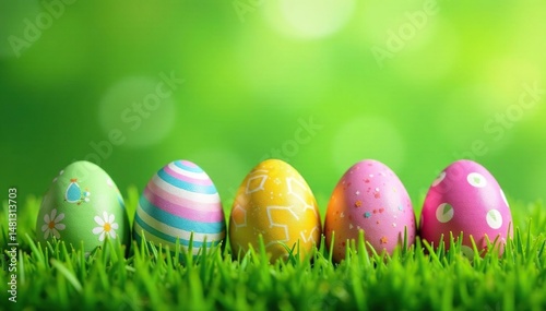 Decorated Easter eggs on a green grass background , bunny, chocolate, easter