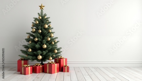 Decorated evergreen tree with golden ornaments and red gift boxes Christmas tree gifts