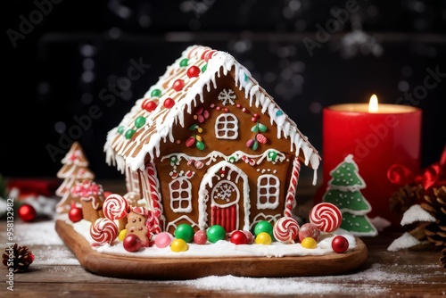 Decorated Gingerbread House with Candy Canes and Christmas Decorations