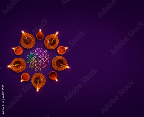 Decorated natural lit clay oil lamp placed on dark purple background with copy space, Diwali background, Diwali festival greetings