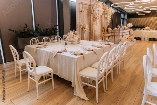 Decorating a hall for an expensive luxury wedding in a restaurant with lights, flowers, and seating details for guests