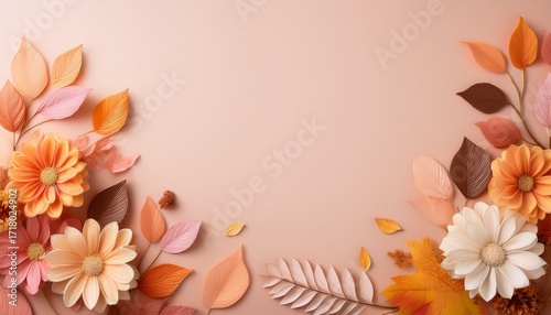 Decorative Autumn Background With Copy Space With Leaves And Flowers In Pastel Colors