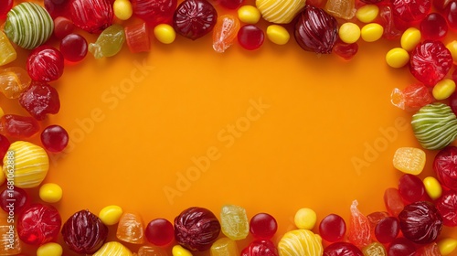 Decorative border made of generic Halloween candy corn and assorted sweets with copy space.