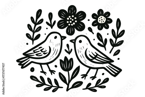 Decorative composition of two stylized birds and various botanical elements in monochrome