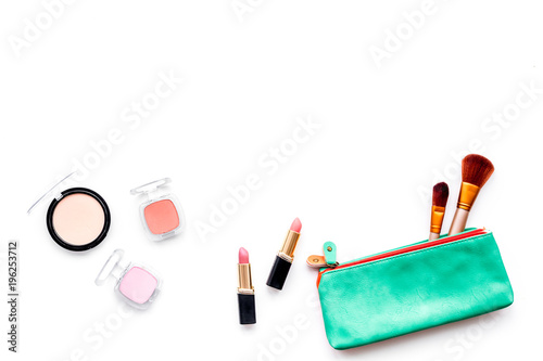 Decorative cosmetics background. Eyeshadow, rouge, brushes, lipstick in cosmetic bag on white top view copy space