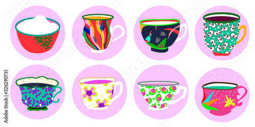Decorative Cup design for cafes, tea, juice, posters, banners, postcards. Isolated on a blue background. Various drawings and patterns. Hand drawing