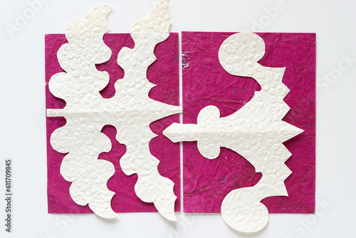decorative cut paper shapes (thistle leaf and finial) on magenta pink and white paper