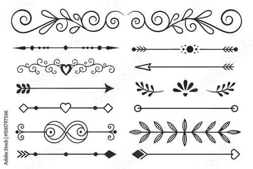 Decorative Divider Elements in Elegant Hand-Drawn Black Vector Featuring Arrows, Floral Motifs, and Swirled Lines for Layout and Invitation Projects.
