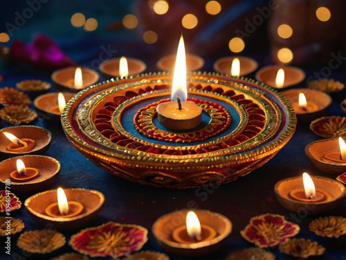Decorative Diwali Candles with Glowing Flame—Indian Festivities, Festival of Lights, Traditional Religious Decor, Cultural Celebration, Spiritual Lighting, Holiday Art