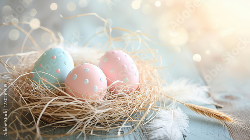 Decorative Easter Eggs with Polka Dots in a Nest on Rustic Wooden Background with Warm Bokeh Lights
