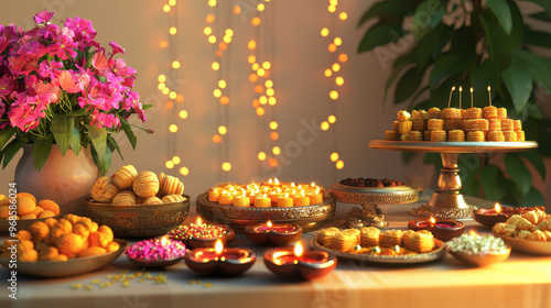 Decorative festive table arrangement featuring assorted traditional sweets, candles, and vibrant flowers for celebrations