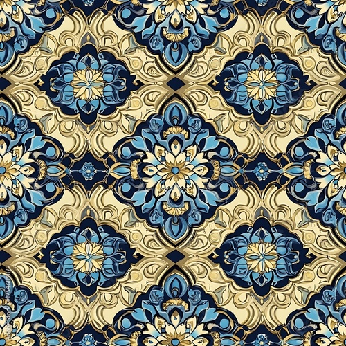 Decorative Floral Pattern Texture in Elegant Blue and Gold Tones