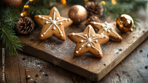 Decorative gingerbread stars and shiny holiday ornaments arranged on a wooden board with lush pine branches for festive celebrations