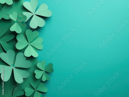Decorative Green Paper Hearts on a Solid Turquoise Background for St. Patrick's Day and Spring Celebrations, Perfect for Invitations and Seasonal Designs