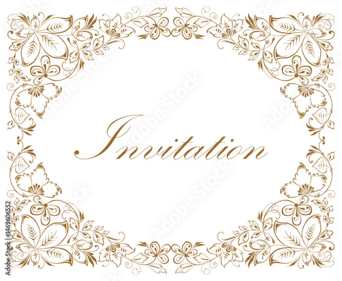 Decorative greeting card with outline floral golden border of leaves, flowers, tendrils, lettering invitation