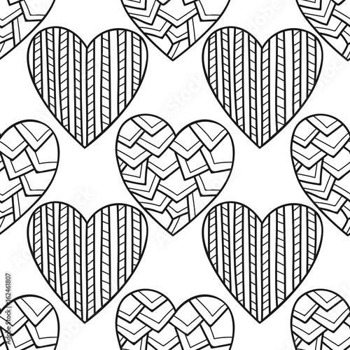 Decorative hearts. Black and white seamless illustration, pattern for coloring book, page