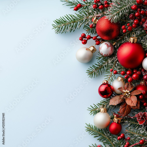Decorative holiday arrangement featuring red and white ornaments amid festive greenery against a light blue background