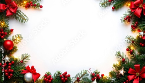Decorative holiday frame with red bows, flowers, and ornaments for festive celebrations