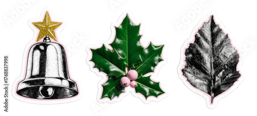 Decorative Icons of Bell, Holly Leaf, and Leaf on Transparent Background